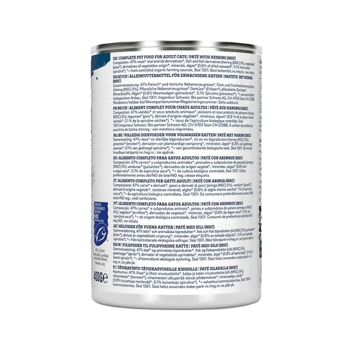 47% Fleisch* und tierische Nebenerzeugnisse* (Huhn, Rind, Schwein), Fisch und Fischnebenerzeugnisse (mit 5% MSC¹ Wildhering), pflanzliche Nebenerzeugnisse*, Gemüse* (Erbsen)*, pflanzliche Derivate*, Mineralstoffe und Algen* (0,6% getrockneten Meeresalgen*, 0,1% getrocknete spirulina*).